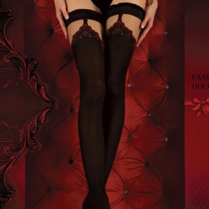 An elegant pair of hold ups in Nero (Black) with a slight touch of Red. A subtle touch of red has been included on the design at the top of the thigh making these hold ups really stand out. Also features a ruffle-like design at the top of the hold ups. This product is presented in luxury embossed packaging.