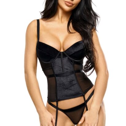 A sensual elegant corset made of delicate tulle and velvet soft touch.?The sexy cut wonderfully emphasizes the figure.?The back is made of flexible horizontally arranged stripes.?Thong is included. Set in an elegant package with a photo of the product marked with a hologram with the Beauty Night Fashion logo. (stockings not included)