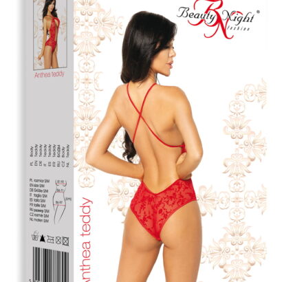 A lovely playful teddy in gorgeous red with very special fabric that has raised flower detail.? Halter neck style with cross over at the back.? Athena Teddy arrives packaged in an elegant box with the picture presenting the product and is marked with the hologram from the logo Beauty Night Fashion. Bag-pouch for storage or laundry included.