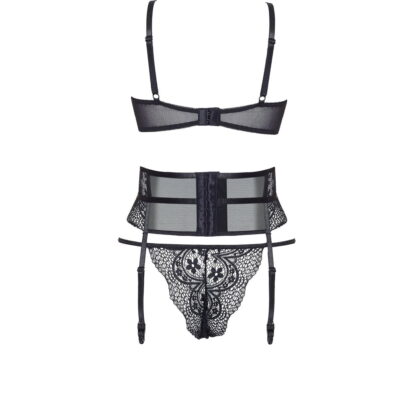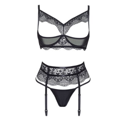 A very provocative three piece set that comprises an open cup underwired shelf bra, matching suspender belt and thong.? ?The black lace on Chiara is both stunning to look at with? beautiful soft feel.? (please note the nipple covers are not included – we have a range of nipple covers which are available separately).? This item arrives packaged in a lovely Beauty Night box.