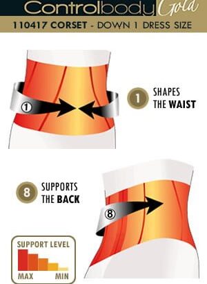 Boned corset with firm compression providing a high level of support. Hook and eye fastening to the back. Shapes the waist and supports the back. Item comes packaged in a Control Body box.