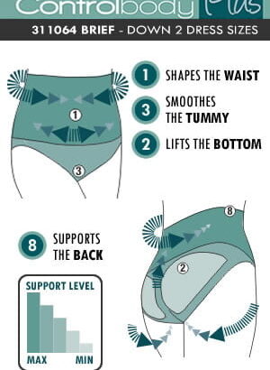 High waist shaping brief. Firm compression providing a high level of support. Shapes the waist supports the bottom smooth the tummy and supports the back. Natural cotton gusset. Item comes packaged in a Control Body box.