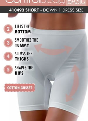 Shaping short with tummy control. Moderate compression providing a medium level of support. Supports the bottom smooth the tummy slims the thighs and shapes the hips. Natural cotton gusset. Item comes packaged in a Control Body box.