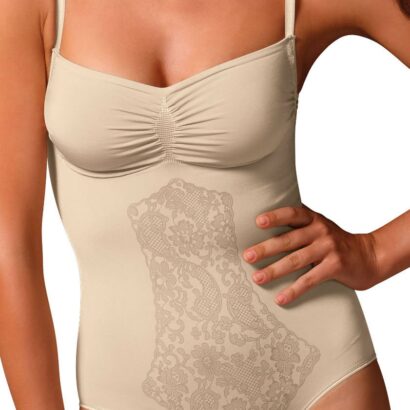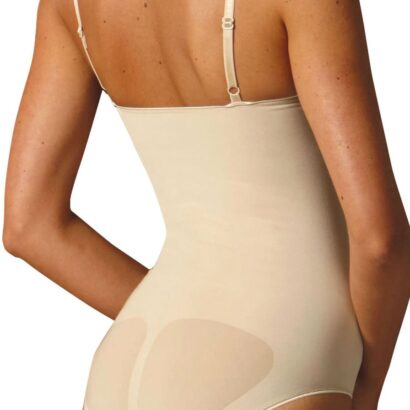Body with fine strap and strong compression. Shapes and enhances the silhouette. Adjustable strap and hook & eye anti-bacterial gusset. Seamless invisible under clothes. Shapes the waist lifts the bottom smooths the tummy supports the bust and supports the back.