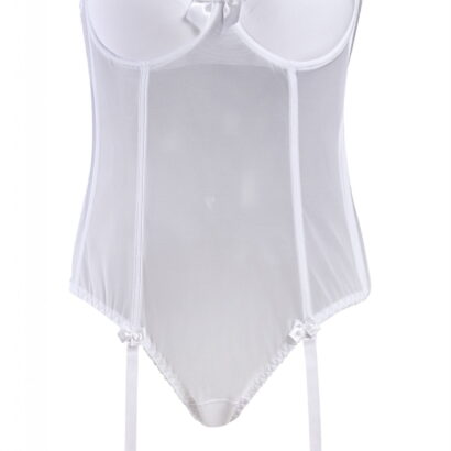A stylish tulle one piece from the newest Gracya collection. Ideal for perfectly shaping the figure with light boning. Body fastens at the side with hooks and eyes which have 2 adjustments. The body fastens in the same way at the crotch. The suspender straps are removable so that the body can be worn with or without them and are decorated with lovely bows. An extremely delicate model designed especially for the bride! Item arrives packaged in a Gracya Box.