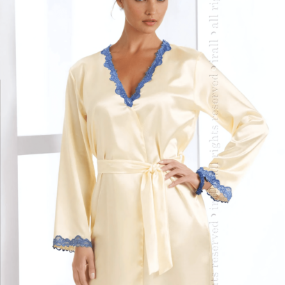 Gloria is a beautiful and classic cream dressing gown made from high quality delicate satin. The neckline and the sleeve cuffs are decorated with fancy scalloped blue lace. Also included is a waist tie. Gloria arrives packaged in her own Irall box with lovely matching tissue paper