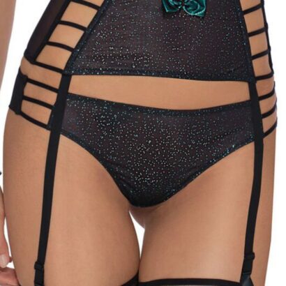 A stunning deep suspender belt made from black fabric with green sparkly effect print. There are five cut out elasticated sections at the sides with side boning. A black organza and satin ribbon turquoise green bow decorates the front. The back has a double hook and eye fastener with three adjustable sections for comfort and fit. The suspender clips are made from metal and are adjustable