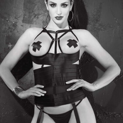 Powerful Satin Elastic sewn together to create a form fitting OPEN BUST BUSTIER with strappy detailing 3 row hook back closure removable and adjustable garters and comes with a G String. Comes with CROSS PASTIES. Color: Black. Sizes: 32-34-36-38. Shown with #90370 Studded Back Seam Fishnet Stockings.