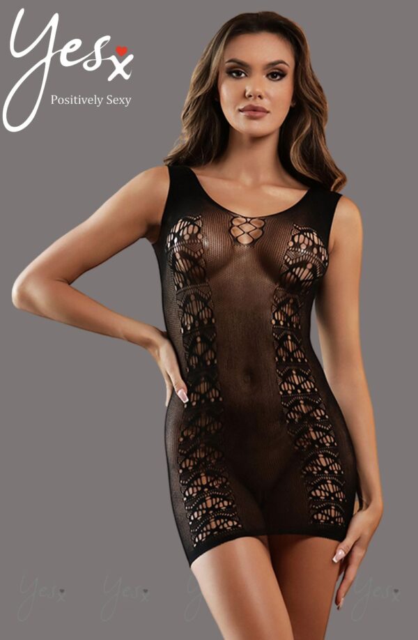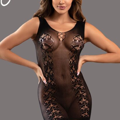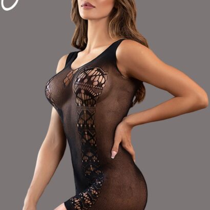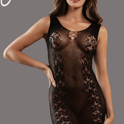 Black sleeveless bodystocking dress.? Items arrives packaged.? Please note thong is not included.