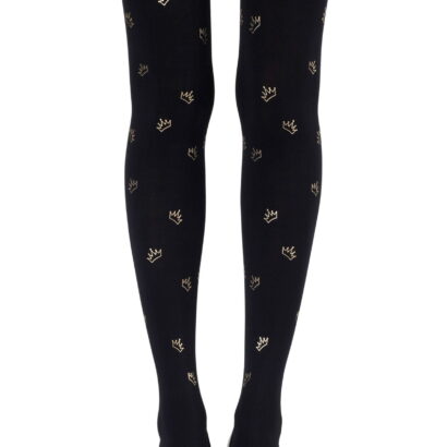 Stand out from the crown. Get the Royal Treatment tights that feature the crown icon in an allover print. Colour: Black tights with Gold print. Thickness: 120 denier. Your entire leg will be getting Zohara love with allover prints. Both sides are not created equal with allover tights so please look at the foot of the tights before wearing to ensure you don’t step on the print. (The front print will be lower than the back.) No doubt you will shine with our metallic prints. Please note that these prints require extra care when washing and will naturally fade with wear. Unless they have X-ray vision no one will be able to see through these opaque tights. Hand print no two are the same.