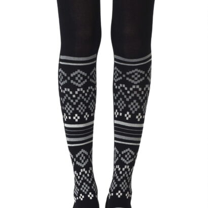 Keep your legs warm and comfy with these sock style tights. If your feeling wild pair them with wool shorts and look like the resident cool girl. Colour: Black tights with Light Grey print. Thickness: 100 denier. Made from Cotton. Unless they have X-ray vision no one will be able to see through these opaque tights. Get athletic with our two-sided knee-high sock-style print. Hand print no two are the same.