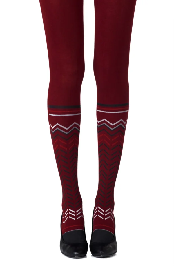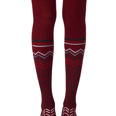 Feel Coachella vibes even in the winter with Zig Zag Walk tights. Featuring a sock-style zig zag print pair with your most fringey items. Colour: Burgundy tights with Grey Black print. Thickness: 100 denier. Made from Cotton. Unless they have X-ray vision no one will be able to see through these opaque tights. Get athletic with our two-sided knee-high sock-style print. Hand print no two are the same